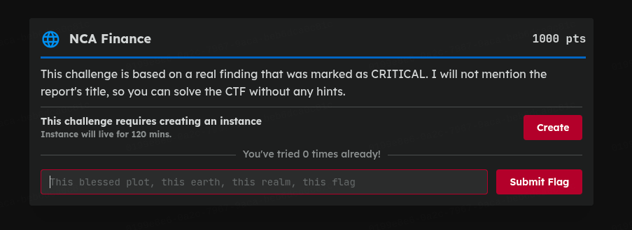 The challenge is called “NCA Finance.” You can create a container and start hacking the application right away.