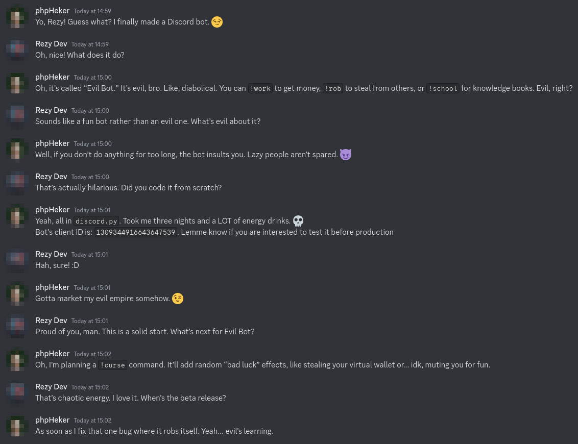 Since I don't want to go over how to download the bot’s source code and set it up in your local environment, I’ve written a detailed README.md on how to get the source code and bring the Discord bot online. You can find it in the GitHub repository here: https://github.com/Rezy-Dev/Evil-Bot